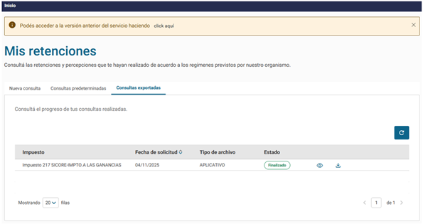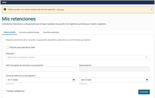 - Se puede continuar accediendo a la versión anterior del servicio presionando en la parte superior de la página, lo cual restablecerá al formato anterior de Mis Retenciones.