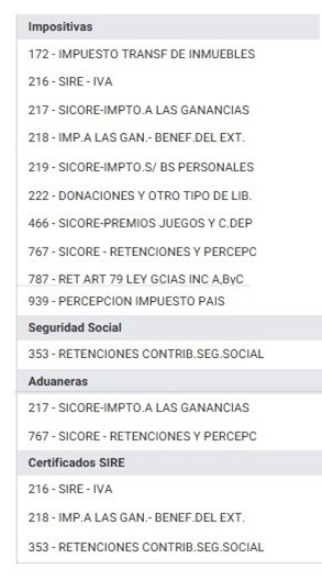 Dentro de las opciones de retenciones y percepciones a consultar, el sistema muestra los siguientes códigos:
