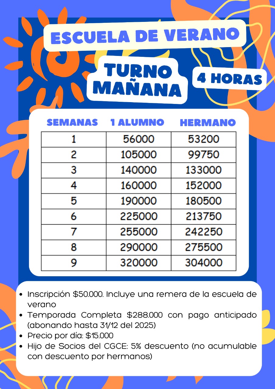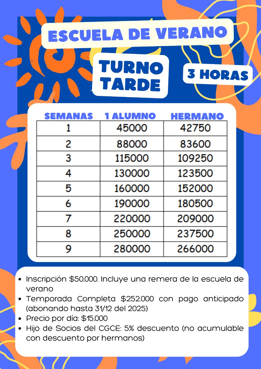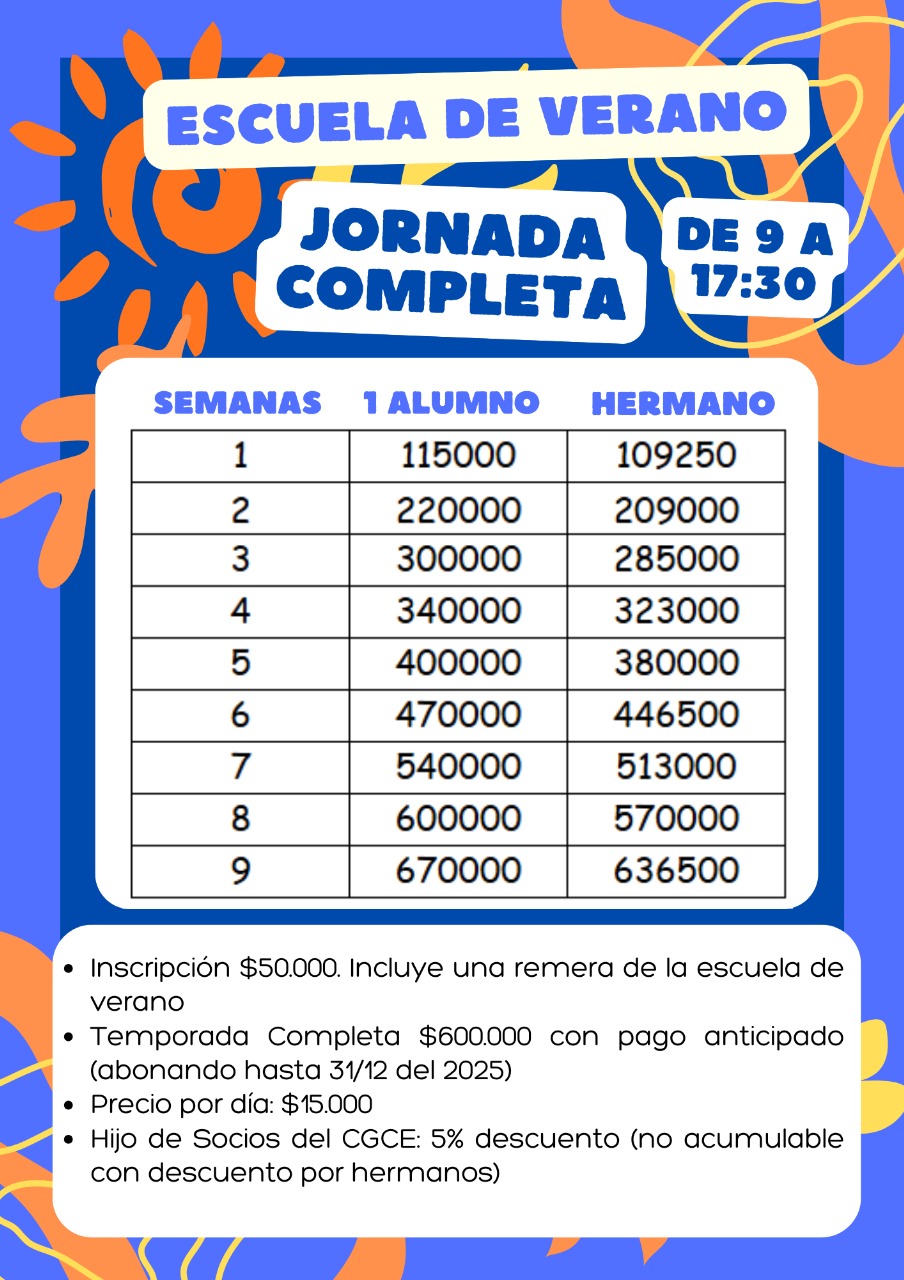 El lunes 15 de diciembre comienza la Escuela de Verano del CGCE para niños de 3 a 12 años en turno mañana de 9 a 13, tarde de 14:30 a 17:30 o jornada completa.