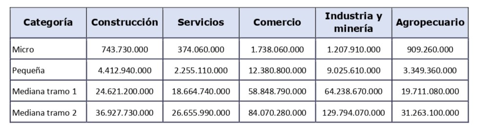 De esta manera, desde el 1 de abril, los nuevos montos de límites totales de ventas anuales quedan en $ 36,93 millones para la construcción; $ 26,66 millones para los servicios; $ 84,07 millones para el comercio; $ 129,79 millones para la industria y minería, y $ 31,26 millones para el agro.