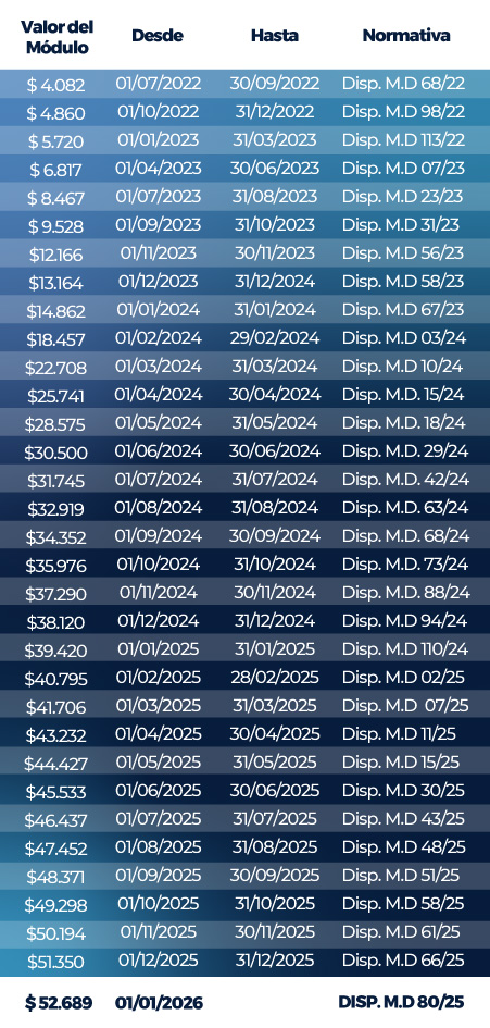 A través de la Disp. MD 80-25, se estableció que el valor del módulo previsto en la Resolución N.º 71/08 – Anexo I asciende a $52.689, con vigencia desde el 1 de enero de 2026.