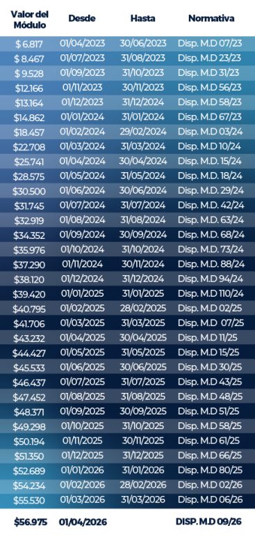 La tabla muestra la evolución en el valor del módulo desde la creación de los mencionados honorarios indicativos.