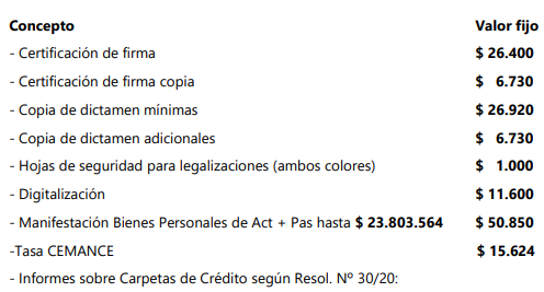 Asimismo, la Disp. MD 68-25 introduce la actualización de los valores fijos correspondientes a trámites de legalización que se realizan en el Consejo, como certificaciones, copias de dictámenes, hojas de seguridad, manifestaciones de bienes e informes de carpeta de crédito.